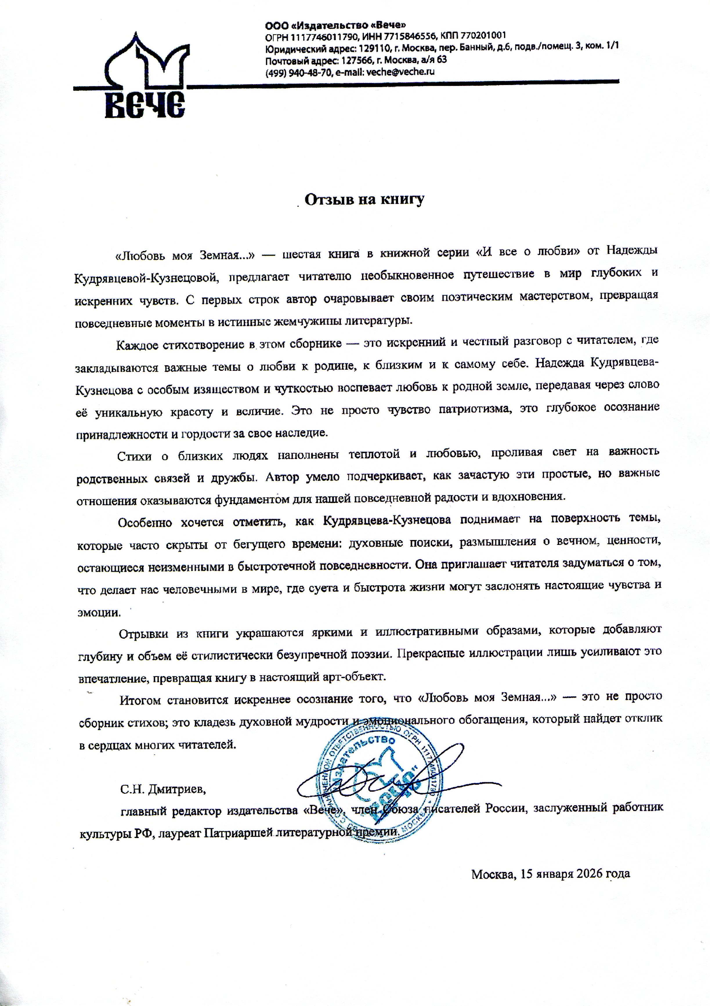 Кудрявцева-Кузнецова, Н. Я. Любовь моя Земная. Книга о любви и о Памяти в честь 80-летия Победы в Великой Отечественной войне 1941-1945 годов : стихотворения / Н. Я. Кудрявцева-Кузнецова. – Москва : Издательский дом «Стафеефф и К», 2025. – 177, [2] с. : ил. ; 21 см. – (И все о любви ; кн. 6).